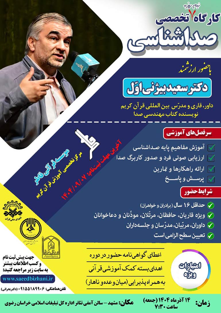 مشهد مقدس - موسسه آموزش تخصصی فاطر با همکاری شورای عالی قرآن کشور، اداره کل تبلیغات اسلامی خراسان رضوی و جامعه قاریان قرآن مشهد، بنا دارد برای نخستین بار در سطح استان، کارگاهی تخصصی با عنوان «صداشناسی» با تدریس قاری و استاد برجسته بینالمللی، دکتر سعید بیژنی، نویسنده کتاب مرجع «مهندسی صدا» برگزار کند.